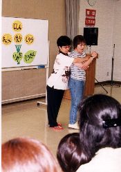↑ 知らない人に捕まえられそうになった時の逃げ方を体験学習する小学校1年生。  ↑ 子ども向けのロールプレイの再現シーンを身を乗り出して見る大人。