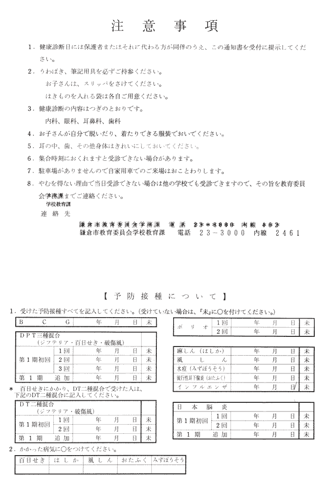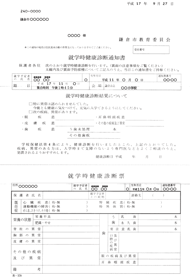 | 9月上旬 | 就学時健康診断受診票が自宅に送付されます。受診票の画像はこちら >>表面/裏面 |