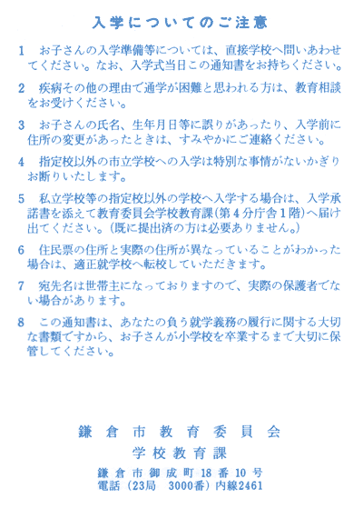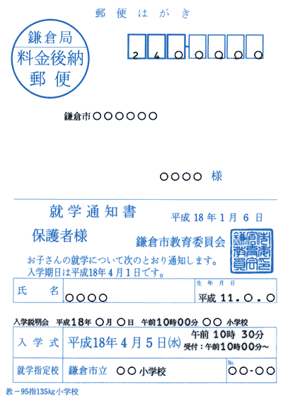 | 1月上旬 | 入学通知書が自宅に送付されます。通知書の画像はこちら >>表面/裏面 指定の市立小学校名、入学説明会や入学式の日時が記載されています。 入学説明会・入学式では、この通知書を持参して受付で提示します。 |