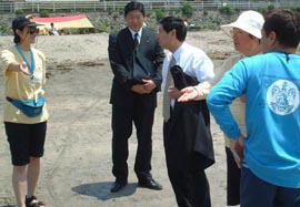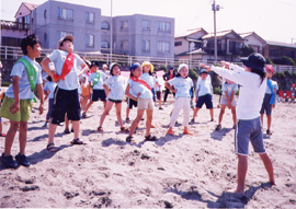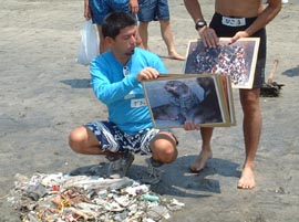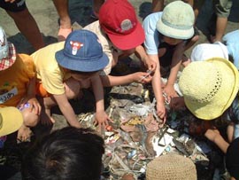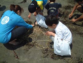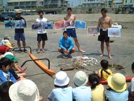 一方、ビーチクリーン班はビニール袋を手に海岸のゴミを拾います。集合の合図とともに、ゴミを一箇所に集めてみました。「このゴミを自然のモノと人間が作ったモノに分けてみよう」・・やってみると、人間のゴミの方がはるかに多いことがわかります。「さて、こういうゴミが海の動物たちにどういう影響を与えるか知っているかな?」KOCが見せてくれた写真には、異物を飲み込んで死んだウミガメや、プラスチックの輪が口にはまってしまったアシカなど、無惨な動物たちの姿が写っていました。自分たちでゴミを集めた直後だけに、いつになく神妙に話に聞き入る子どもたちの顔が印象的でした。
