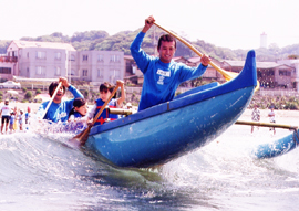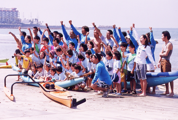 「晴れていても沖の風が強いと舟が出せない場合がある」・・。最も天候が気がかりだった今回のプログラム。最高のカヌー日和に恵まれ、材木座海岸では、2艇の4人乗りアウトリガーカヌーと、20名を超える日焼けしたKOCメンバーが子どもたちを出迎えてくれました。