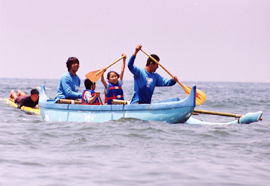 カヌー体験班は、さっそくパドルの使い方をKOCのお兄さんたちに教えてもらいました。波打ち際で練習してから、2人づつの組になってカヌーに乗り込みます。アウトリガーカヌーは、バランスを取るための浮きが本体の横に大きく張り出しており、かなり安定度が高いカヌーです。しかし相手はホンモノの海。全員救命ベストを身につけ、緊張の面もちで出航! 前後を頼もしいKOCメンバーに守ってもらいながら、かなり沖の方まで漕ぎだしていきました。無事に帰還後、「漕ぎ出す時はパドルが重かったけど、動いている時は軽かったよ!」「波がきた時、すっごく揺れた!」と興奮気味に話す子どもたち。「海は遠くから見ると青いのに、近くで見ると緑だったよ」と海の色がかわる事に気づいた子もたくさんいました。