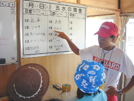 | ↑ 海水の温度や海水浴客の数をチェック | ↑ レスキューボードにさわってみたよ |