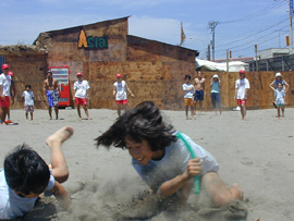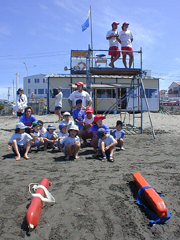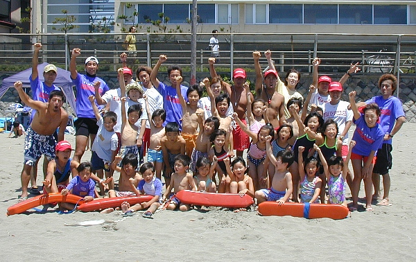 | ■7月20日海の日は真夏の太陽が照りつける暑い一日になりました。今日は、海岸でライフガードの仕事を実際に見せてもらう約束です。日焼けで真っ黒なお兄さんの腕にぶら下がったり、お姉さんと波打ち際で追いかけっこしながら、まずは豆腐川河口近くの材木座監視所へ。 ■A班は監視所内を見学。そこには万一に備えて看護婦さんと漁師さんが待機していてびっくり。水温、気温をチェックし、海水浴客数や沖のヨット数などを数える「五水の調査」に子どたちも挑戦。ケガ人や溺者が出た時に使う機材の数々や、ライフセーバーが海岸に向けて放送する様子を間近で見せてもらって興味津々。 ■B班は監視所の外でレスキューボード、レスキュー船、チューブ、レシーバーなどの使い方を教えてもらいました。双眼鏡をのぞいて、つかの間ライフセーバー気分を味わいます。C班は、監視所近くでのビーチクリーン体験。これもビーチの安全を守るために必要な活動のひとつ。あっという間にゴミの山ができてびっくり! ■ABCすべてを体験してから、中央海岸に戻ってのお楽しみ、鎌倉Kid's programビーチフラッグ大会です。学年ごとに分かれて、フラッグならぬゴム製ホースを浜で取り合いました。各学年の勝者が集まっての決勝戦は大白熱!優勝は腰越小3年の井上クン!! みんなすご〜くカッコよかったよ! ■最後はライフガードのメンバーと共に全員で海へG0! いつもはおっかなびっくり腰が引けちゃう子も、今日はたくましいお兄さんと一緒とあってジャブジャブと海に入っていきます。レスキューチューブに捕まって浮かんでみたり、波をジャンプしたり・・。「材木座海岸って意外と遠浅で子どもたちでも結構遠くまで入れるんだね」「こんなに楽しそうに海で遊ぶのは初めてかも・・」と、お父さんお母さんは感動。 ■「楽しかった〜」と言いながら、浜にあがって記念撮影、解散。海で安心して遊べるのは、ライフガードのメンバーが安全を守ってくれているからだってこと、ちゃんと伝わったかな? 海水浴シーズンはまだ始まったばかり。お兄さん、お姉さん、8月31日まで頑張ってね。 感想は→こちら |