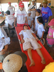 | ↑担架で運ばれる気分も体験 | ↑ 材木座監視所前で | ↑ あら、こんなにゴミが・・ |