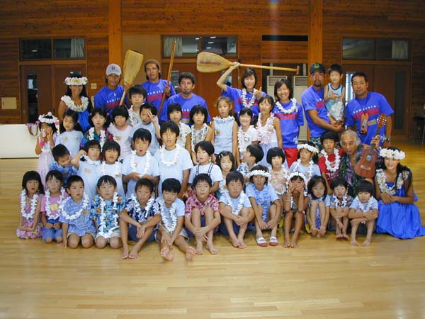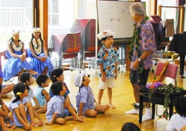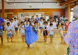 | ■「ウクレレとフラ!」待ち遠しかったのは子どもよりも親だったかもしれません。受付ももどかしく、アロハ姿の講師クマさんとムームーのダンサーの方2名を見つけると、ウクレレがおいてあるピアノの周りに集まります。みんなのわくわく感が伝わってきます。 ■まずはレイについて習います。自然に感謝して、花や木の実、貝殻などでできています。それはハワイの人たちの自然と人間が融和する文化の象徴でもあります。「マハロ」「アロハ」とハワイの挨拶も覚えました。いろんなレイを見せてもらいます。クマさん自慢のきれいなレイを頭に乗っけてもらって、ちょっとうれしい。 ■自然に感謝を込めて、自分たちでもレイを作ります! 素材は木からできた梱包材。慣れないけれど、針と糸を使って思い思いの向き、組み合わせでつないで行きます。KOCのメンバーは手伝ったり、見守ったり。親も見守るはずだったけど、こんな楽しいことは私たちも! 親用のレイもできました。 ■ウクレレについても習います。ギターよりも2本弦が少ない4本の弦。そのままひくと「はなこさん」という音に聞こえるよ。クマさんの説明は面白くて納得してしまいます。普段見ることの少ないウクレレに触るのはおっかなびっくり。音が実際に出ると子どもの顔は本当にうれしそうにはじけます。 ■クマさんとダンサーの方のフラ実演。パドルを使ったカヌーの踊り「ワン・パドル・ツーパドル」その後、振りの意味を教わります。振りの一つ一つにも歌詞と同様の意味がある・・・なんて素敵。ダンサーの方たちの背中を見ながら、いよいよダンスを始めます。すごく真剣な顔で体を動かしてみます。やってみると意外に難しくて手と足がちぐはぐ。わからなくって棒立ちになっちゃうことも。ほらほら、そこはこう・・・後ろで見ている親もいつの間にか踊っています。 ■ぎこちなくも元気いっぱいの子どもたちのダンスの後ろで踊る親の熱意が伝わってしまったのでしょう。クマさんに「さあ、次はお母さん、お父さんたち前に来て踊りましょう」の一言が。「え、え・・・」といいつつ、いざ大人のダンス! 「月の夜は」。 子どもたちが真剣に心配…もとい見つめる中、大人たちも子どもたちに負けずに踊りました。クマさん、KOCの皆さんの美しい演奏をバックに気分よく踊り、自然を大事にしたハワイアンの気持ち体で感じました。 感想は→こちら |