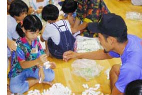 | ↑ レイの説明。頭にのせてもらいました。 | ↑ さあ、自分で作ろう! 針の使い方が独創的で危なっかしい。 |