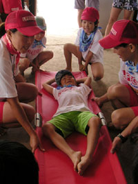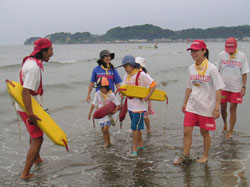 | ■連日雨と曇りの肌寒い天気が続く中で迎えた夏休み初日、ライフガードの仕事を半日体験するプログラムを実施しました。今回は、LIFE GUARDと胸に書かれたお揃いのTシャツを着ての参加。お天気はいま一つだったけど、気分は多いに盛り上がりました。 ■ライフガードの仕事は大きく分けて次の3つ。(1)監視:ビーチの利用者が安全に楽しく過ごせるように監視する。 (2)依頼:ルールやマナー違反をしている方にお願いして、その行為を中止していただく。 (3)救助:万一の事故発生時に救助、手当、通報、運搬などを行う。・・「救助」のみがクローズアップされがちなライフガード業務ですが、実は、事故を未然に防ぐための「監視」や「依頼」こそ重要な仕事です。たとえば、ビーチでケガをしないようにゴミを拾う「ビーチクリーン」だって、ライフガードの任務の一つなのです。 ■子ども達は、監視タワーに登って望遠鏡で沖にいる人の様子を眺めたり(楽しんでいるか苦しんでいるか、表情を見ることが大切!)、レスキューチューブやトランシーバーの使い方を教えてもらったり・・。おぼれそうな時は、浜にむかって大きく手を振ると「助けて!」のサインになることも覚えました。 ■材木座監視所の中も見学しました。監視所には、万一の時に救助船を操縦する漁師さんや、看護婦さんが待機しています。海水浴場に来たら、まず監視所の上にはためく旗の色をチェック。「赤」だったら遊泳禁止。「黄」だったら遊泳注意。今日は「青」だから遊泳可。「やった〜!」 ■待ちに待った自由時間は、ライフガードのお兄さんお姉さんと海へ! 夏らしいカンカン照りの太陽は顔を見せなかったけれど、レスキューボードやチューブにつかまって思いっきり海遊びを楽しみました。 ■ちなみに今回のビーチフラッグ大会の優勝者は、4年と6年の女の子。「女の子の方がたくましいなあ」と、ライフガード責任者のつぶやき・・。実は今年のライフガード、女性の方が多いんだとか。みんな、高校生になったら、ほんとのライフガードになって鎌倉の海を守ってね! 感想は→こちら |