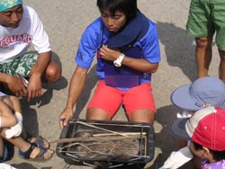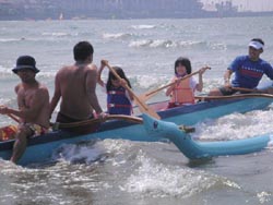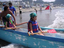 | ■9月になり、海の家こそ取り壊されたけど、夏はそのまま材木座海岸に居座っています。今日は、鎌倉キッズプログラム最終回。「キッズプログラムと言えばカヌー!」の声にお応えして、今期2回目のカヌー体験&お楽しみのバーベキュー大会です。 ■アウトリガーカヌーも2回目となると、子ども達の表情にも余裕が。今回は搭乗前に、「沖から何が見えるかな?チェックしてこよう」という宿題が出されました。だけどみんな漕ぐのに夢中で、沖に出たらワクワクしちゃって、宿題がちゃんとできた子は少なかったみたい・・。まあいいか。カヌーの待ち時間には、特別に用意してもらったボディーボードにも挑戦! 初めてなのにスイ〜ッと波に乗れる子が続出して、スタッフもびっくり! ■今日のもう一つの宿題は、「班ごとにマッチ10本と半分の新聞紙で火をおこしてみよう!」です。せっかく浜でバーベキュをやるんだもの、火ぐらい自分たちでおこさなくちゃ。でもマッチにさわるのも初めて、というような子どもたち。ほんとに大丈夫? ■そこはKOCのお兄さん、お姉さんたちが頼りになります。海岸に落ちている流木を使って、上手に火をおこす方法を教えてくれました。わずか1本のマッチの火を大切に大切に育て、やがてコンロ中を覆う立派な炎になる様子を目の当たりにした子どもたち。自分でおこした火で焼く魚は、さぞおいしいだろうなあ。 ■届けられた食材は、しらす(KKP恒例のしらす丼!)、かます、たかべ、いか、さんま、たこなど、いずれも湘南の海の幸です。普段は魚にあまり食指が伸びない子どもたちも、今日はダイナミックにかぶりついていました。鎌倉ワカメを入れたみそ汁、ゆでだこなども大好評。大勢でワイワイ食べる御飯はほんとおいしい! ■たらふく食べたあとは、表彰式です。キッズプログラムを通じて、大いに遊び、学んだ証として、一人一人名前と写真入りの「修了証」を手渡してもらいました。たった4回だったけど、鎌倉の海というステージで、かけがえのない宝物を手にした子どもたち。この体験は、みんなきっと忘れないよね。そして自然を愛し、鎌倉という環境を愛する大人に成長してくれますようにと、スタッフ一同願っています。 感想は→こちら |
