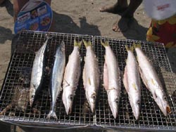 ↑ お兄さんたちと食べる魚は格別!! |