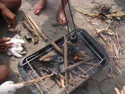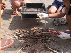 | ↑ 火おこし班はコンロ前に集合。 | ↑ みんなで集めた流木を使うよ。 |