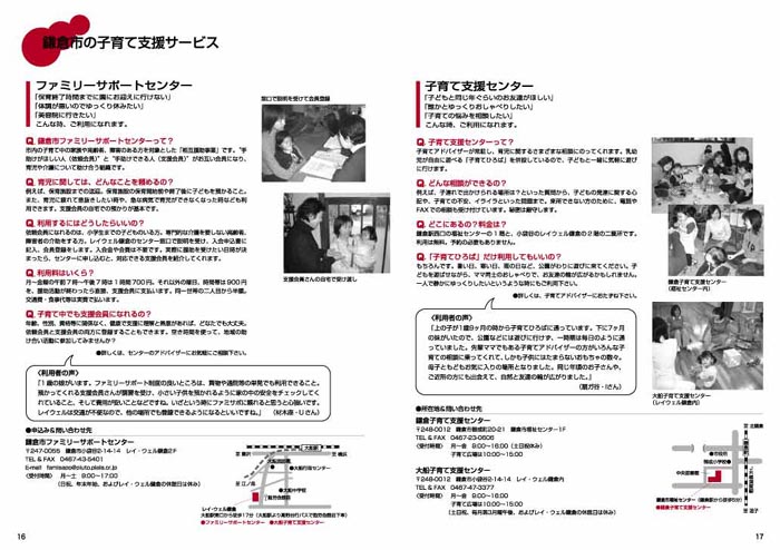 ■他に、各子ども会館の詳しいイラストマップ、子育て支援センターとファミリーサポートの「わかりやすい」利用案内、幼稚園保育園の一覧、困ったときの相談窓口なども掲載。鎌倉で子育てする際に必要と思われる情報を、この1冊にギュッとつめこみました。