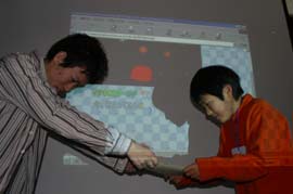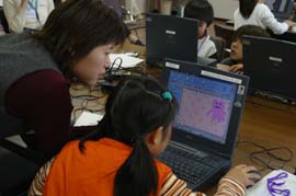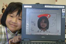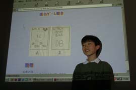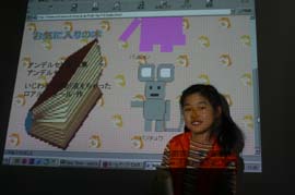 ■オリエンテーションと復習。ホームページの作り方をもう一度思い出します。今日は各自の作業が多いから、わかっていないとたいへんです。 ■各自作業に取りかかります。どんなホームページにしようか設計図をもとに講師の皆さんに説明してアドバイスをもらいます。描いてきたイラストはスキャナーで取り込んでもらいます。自分で作るから講師の先生もお友達もお父さんお母さんもアドバイスはできても、代わって手伝うことはできません。みんな設計図と作ってきた素材を見て、考えながらトライアンドエラー。 ■だいたいできたところで、こまめにアップロードしていきます。各自の作業なので、わからないことは仲間同士で聞きあったり、講師の先生に聞いたり。今日は講師の先生、あっちでもこっちでもそれぞれの質問が出て引っ張りだこです。 ■出来あがったホームページをスクリーンに映し出して、それぞれ発表します。どんなページ?、どんなところで苦労したか?などを語ります。満足の行くホームページができて、みんなの顔は輝いています。先生たちがていねいにコメントしてくれて、終了の表彰状をもらい、4回の講座は無事終了しました。 ■キッズホームページ講座のページ |