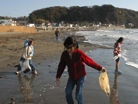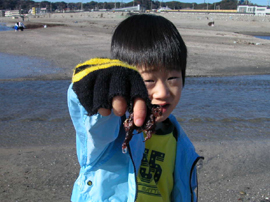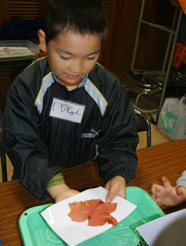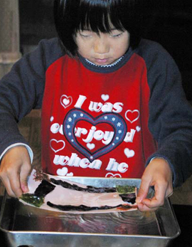 | ■押し花や押し葉を作ったことがある子は多いけど、海藻でも「おしば」ができるの知ってる? 生きた海藻を紙に広げて、押しつぶして「おしば」を作るなんて、海が身近にある鎌倉ならではの楽しみかも。 ■まずは材木座海岸へでかけます。目につくのは砂浜にうち上げられた大きな海藻。でも「おしば」にするなら、波打ち際に漂っているような小さな海藻の方が向いています。色や形、いろいろな種類を集めましょう。拾った海藻は、海水を入れたバケツやビニール袋にいれて、屋内へと移動。 ■海藻は水道水で砂やゴミを洗い落とし、さらに5〜10分水にさらして塩をぬきます。赤い、繊維の細かい海藻はササっと洗うだけでOK。そして水をはった深めのバットやプラスチックケースに浮かべておきます。 ■自分のお気に入りの海藻を選んだら、ケースの水の中に画用紙を沈め、その紙で海藻をすくい上げるようにします。何回かやってみて「いいな」と思う形になったら、画用紙をそっと引き上げます。引き上げてから、ピンセットや爪楊枝を使って丁寧に海藻を広げ、お好みの形に。海藻は色も形も透明感もさまざま。いろんな種類の海藻を使って自分の顔を作った子もいました。 ■デザインが終わったら、斜めにした板に洗濯ばさみなどで紙を留めて吊し、水分を落とします。水が切れるまで5〜10分待ちましょう(あまり長く乾かすと海藻が縮んでしまうので注意)。その間に「海からの手紙」を書く準備。まずは自分が紙に貼った海藻をじっと見つめてみて。何かメッセージが聞こえてきましたか? それはきっと「海」が君に語りかけたいこと。君なら、そのメッセージになんて返事を書く? 「おしば」の形が一人一人ちがうように、海からのメッセージもいろいろ。その子なりに、海との会話を紙に書き留めました。■この続きは家に帰ってからの宿題です。「おしば」を貼った紙を、水吸い取り用の布、新聞紙、ダンボールなどで挟み込んでサンドイッチにします。サンドイッチの上に電話帳をのせ、あれば漬物石のような重しをのせて、2〜3日乾燥させます。その間は、朝夕新聞紙をとりかえるか、扇風機で風をあてておけば万全です。 ■完成した「おしば」作品は本当に個性的なものばかり。絵や文字を書き足して遊んだり、パウチッコをすれば世界にたった一つのしおりや下敷きとして使えますね。 |