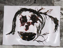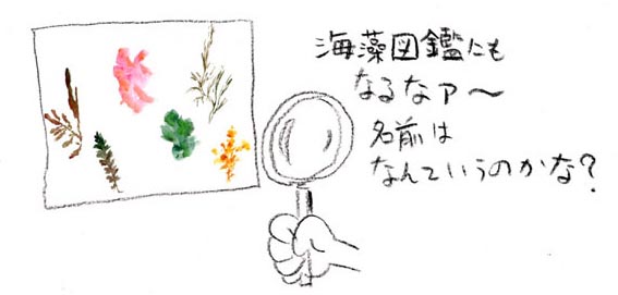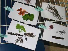 | ↓ いろんな種類の海藻をならべて・・ | ↑ 水に浮かべた海藻をそっと紙ですくい上げます。 |
