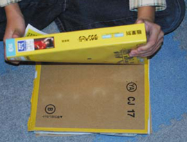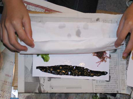 | ↑ 新聞紙と布ではさんで・・ | ↑ ダンボールと電話帳で押さえます |