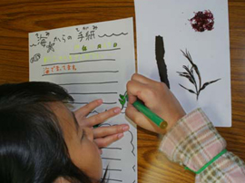 9:00 今日のプログラムの説明 9:15 海藻ひろいスタート 9:40 生涯学習センターに移動 10:10 海藻おしばづくりスタート 11:10 「海からの手紙」「海への手紙」を書く 11:40 海への手紙発表 |