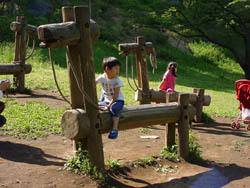 | ↑ こども動物園で。ハツカネズミを膝にのせて。 | ↑ 緑に囲まれた広場の遊具もさりげなくウッディ |